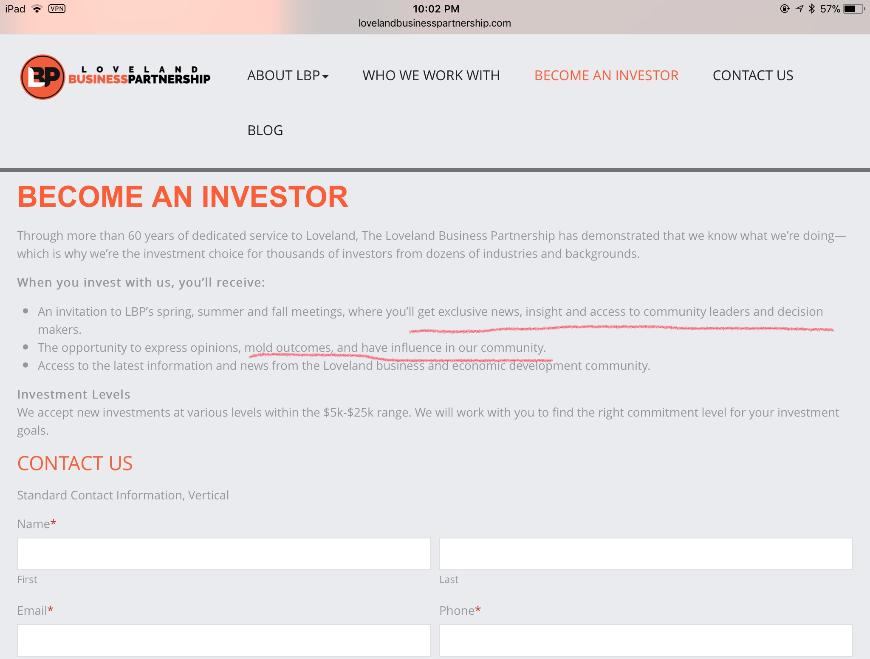 | Loveland Councilwoman Leah Johnson is a member and speaker at Loveland Business Partnership (LBP) meetings which charges "investors" for access to city officials |