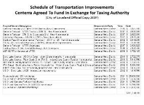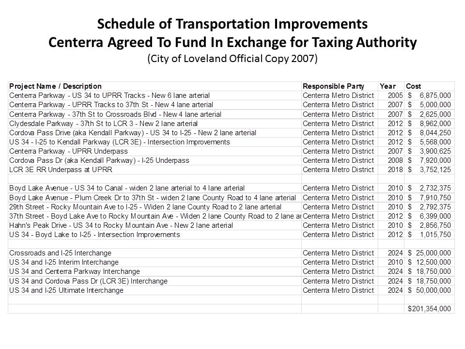 Loveland's 2008 Urban Renewal Annual Report list of Regional improvements Centerra's tax dollars will provide; Page 14 Regional public improvements identified: 1. I-25 and Crossroads Boulevard interchange improvements; 2. Interim I-25 and US 34 interchange improvements; 3. County Road 5 and US 34 grade separation structure; 4. County Road 3E and US 34 grade separation structure; 5. Final I-25 and US 34 interchange improvements; 6.Centerra Parkway / Crossroads extension See original document on city's website |