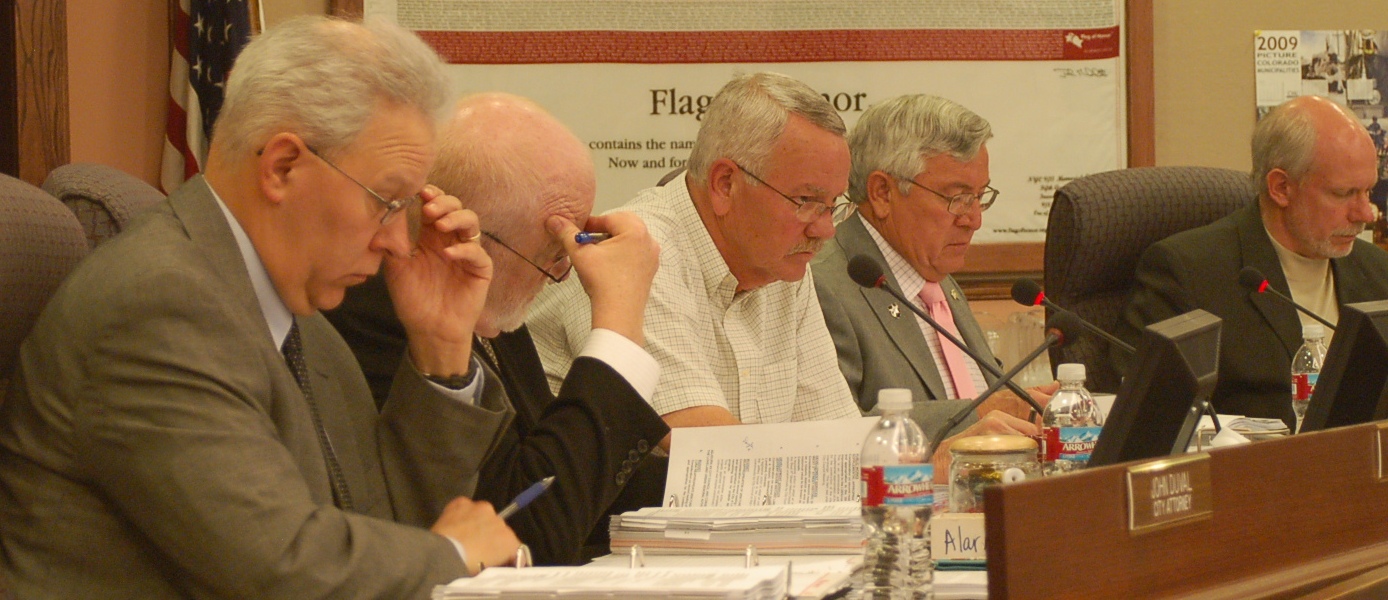 April 21, 2009 Loveland City Council meeting. From left to right: John Duval, City Attorney, Don Williams, City manager, Glenn Rousey, Councilman, Cecil Gutuerrez, Councilman and Dave Clark, Mayor Pro Tem.