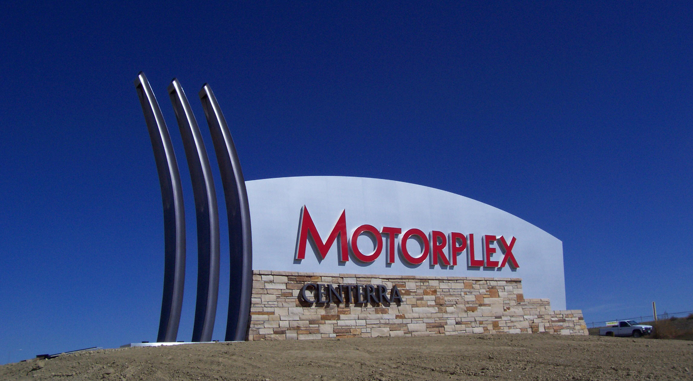 Below: The sign for McWhinney's motorplex that was paid from the $80,000,000 already spent by McWhinney's Centerra Metro District. For travellers along I-25 it confuses them to believe the Motorplex is now in a city called Centerra. McWhinney's Metro District calls this a "public use."