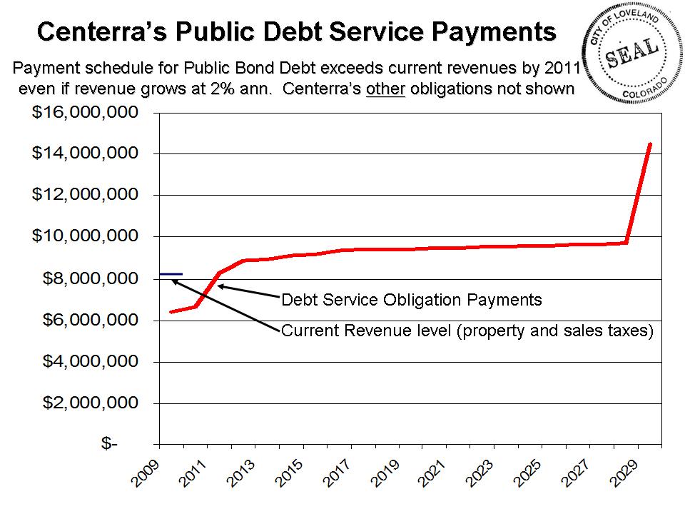 | The far right column titled "Annual Debt Service Fees" shows the escalating payments due on the debt that exceed Centerra Metro District revenue |