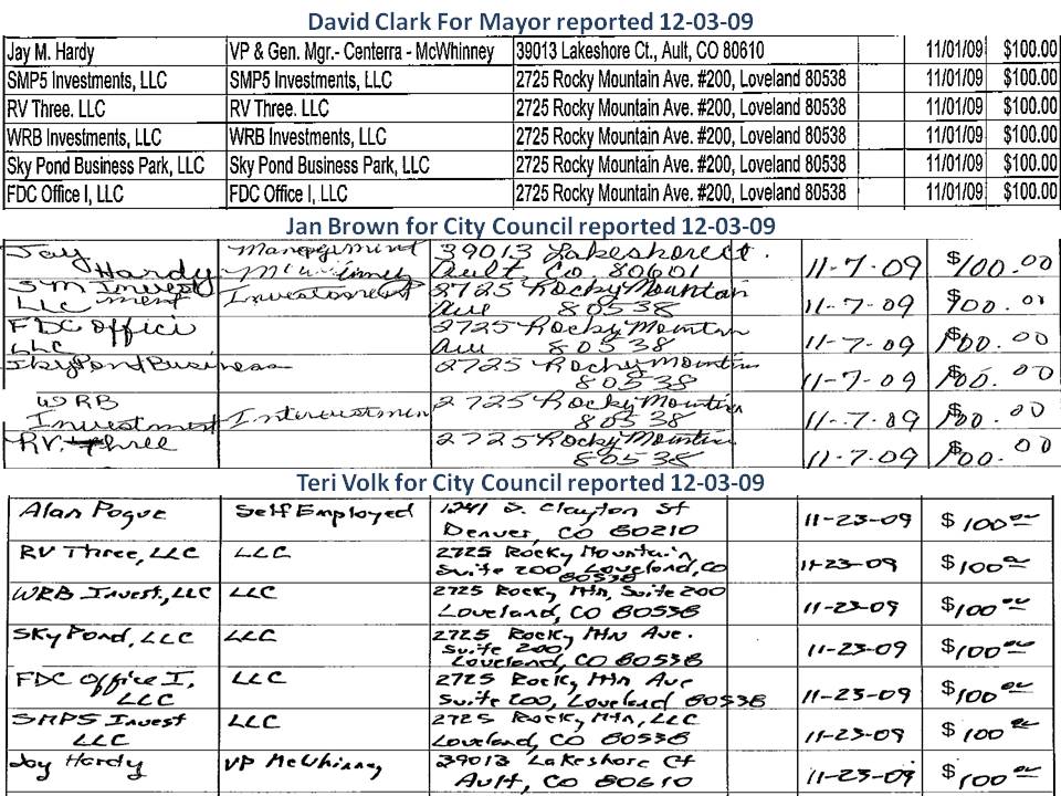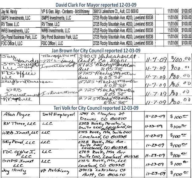 Failed mayoral candidate David Clark reported receiving some $500 from McWhinney staff or controlled companies two days before the November 3, 2009 election while council candidate Jan Brown reported the same $500 in contributions from the same entities but four days after the election while council candidate Teri Volk reported similar contributions were received all on November 23, 2009. (see graphic on the right)