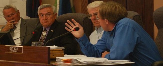 | Councilman Kent Solt (right) explains why he cannot support McWhinney vote to colleagues Above from left to right: Councilmen Glenn Rousey, Cecil Gutierrez, Darryl Klassen and Kent Solt |