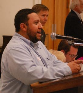| Larry Carillo addresses a Larimer County Republican gathering while State Senator Kevin Lundberg looks on from the background |