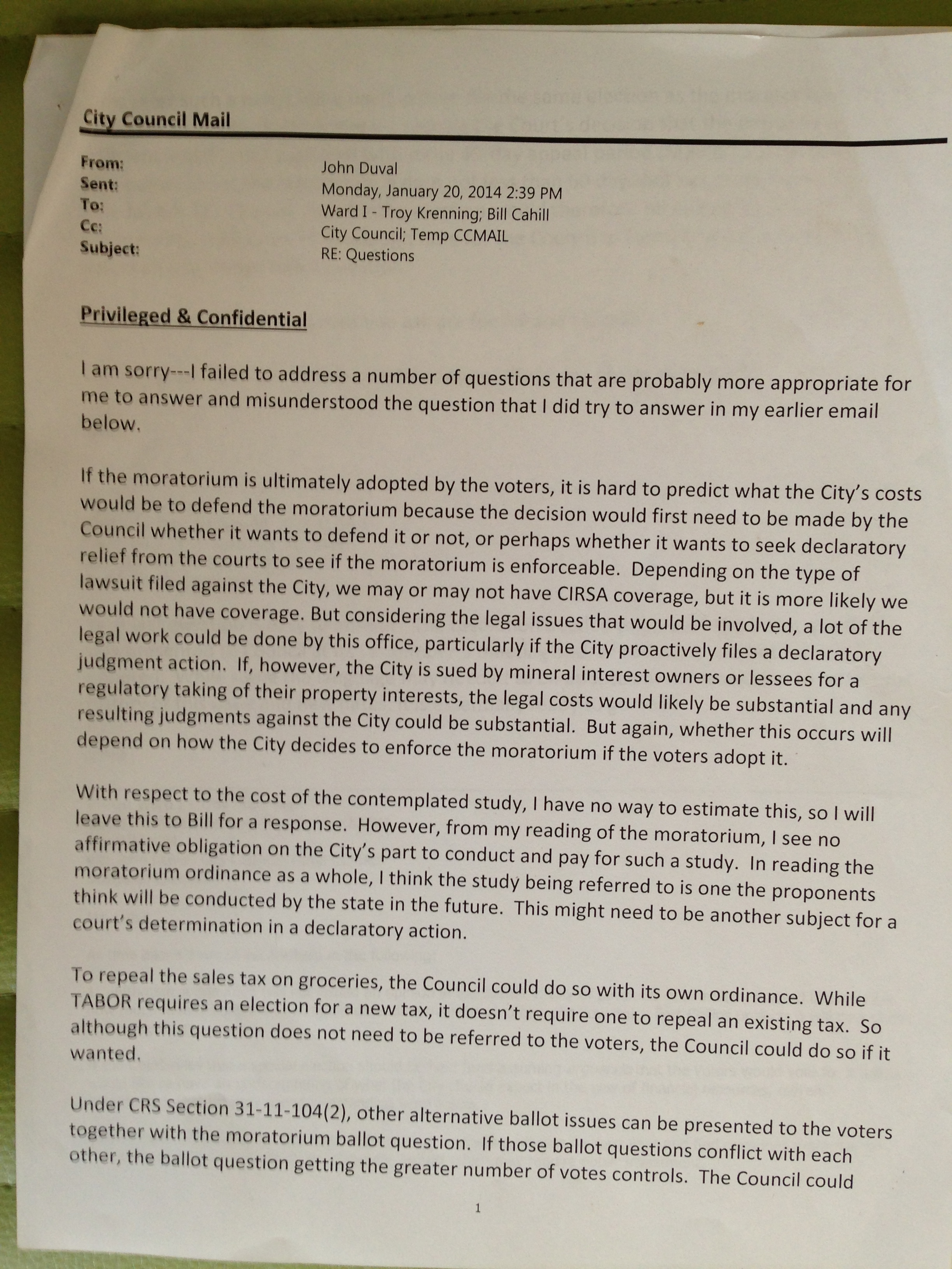 In a "Privileged & Confidential" memorandum to Loveland's City Council on January 20, 2014 Loveland City