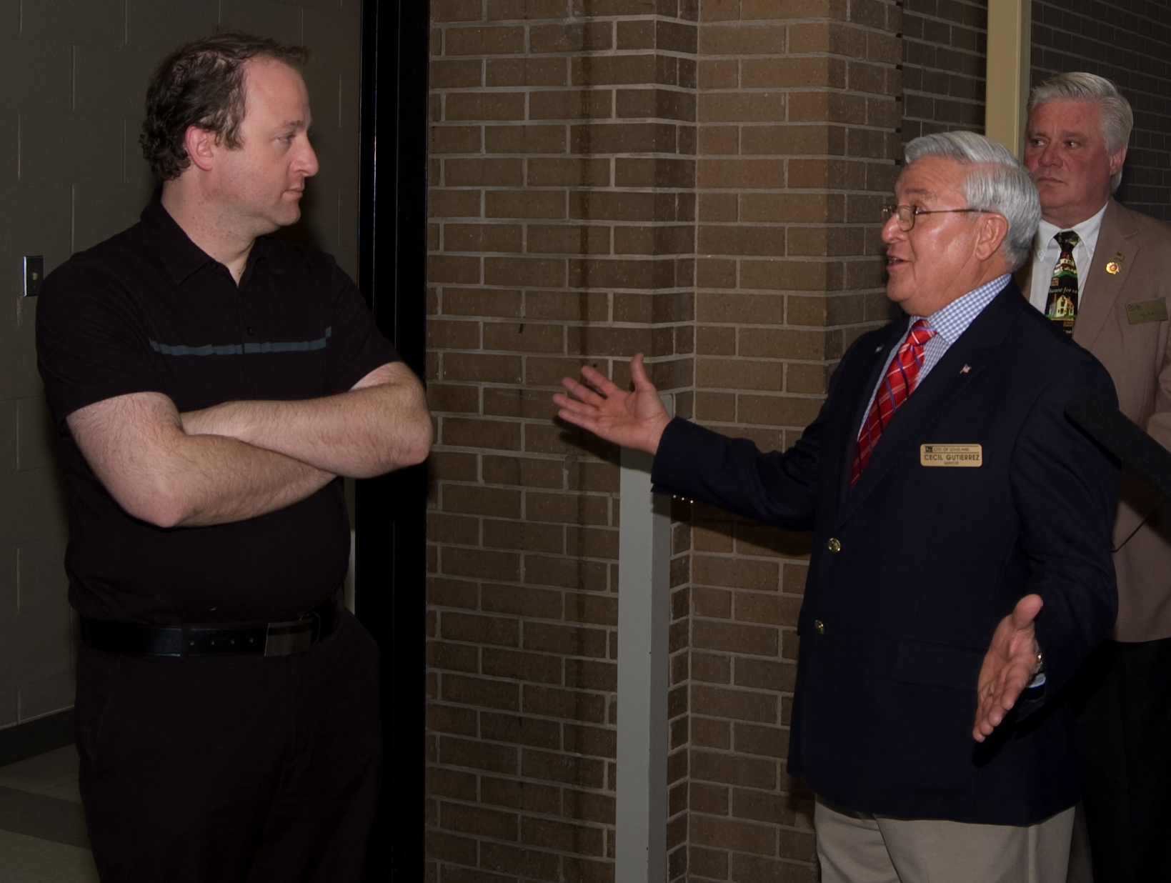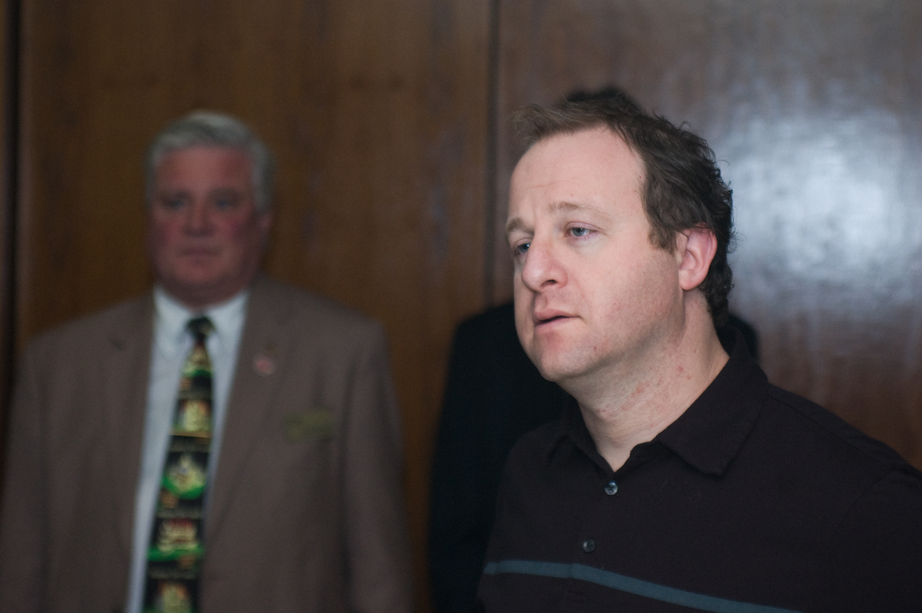 Loveland Mayor Cecil Gutierrez (left) listens to Boulder Congressman Jared Polis (center) along with Loveland Councilman Ralph Trenary (back-right) during a city sponsored tour of Loveland. Councilors Daryle Klassen, Hugh McKean, Cat McEwen, Chauncey Taylor and John Fogle were not in attendance in what the Loveland Reporter-Herald described as "officially a campaign trip into new political territory"