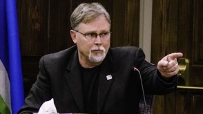| A shaking and red faced Councilman Trenary is comforted by Councilman Talyor who caressed his arm and shoulder for several minutes as Trenary appeared humiliated after he was unable to shout-down Councilman Troy Krenning |