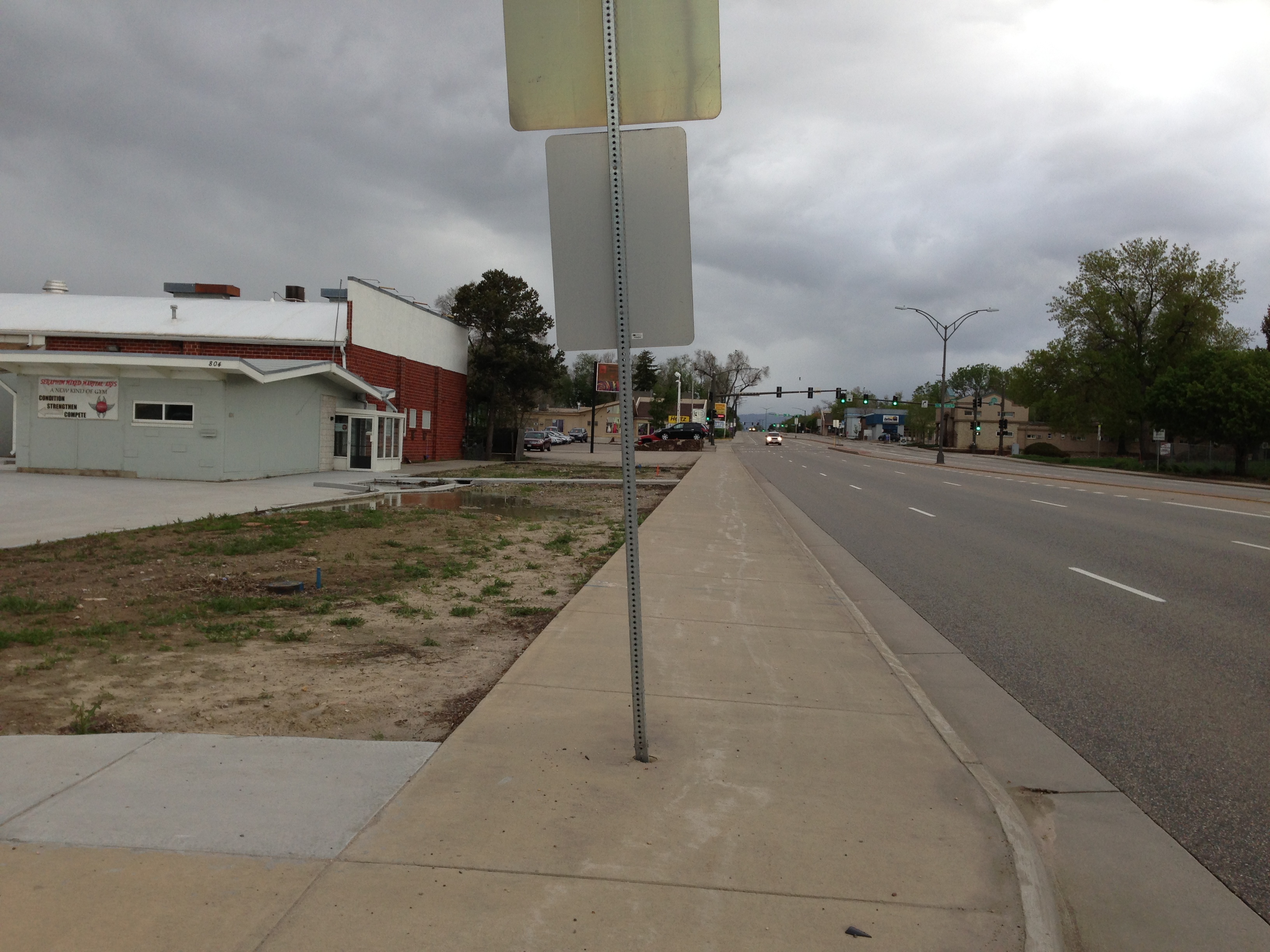 | Looking West on Highway 34 in Loveland, the former Ferguson High School campus and the location Natural Grocers' were purchasing is on the left while the city's highly subsidized Sprouts land acquisition can be seen in the upper right (before the stop light for 287). |