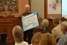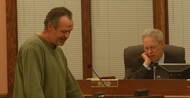 | Above: Larry Ruiter, who owns a house on 3 acres next to the proposed development joked with the council that he uses the remaining portion of Staples Farm for hunting geese. On a more serious note he explained how the proposed development would be detrimental to his property value. |