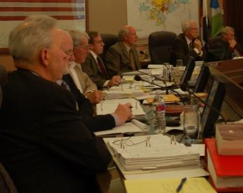 | The Loveland City Council patiently listened to testimony from dozens of citizens. From left to right: Loveland's City Attorney John Duval, City Manager Don Williams, Councilman Klassen, Councilman Solt, Mayor Pro Tem David Clark, Mayor Gene Pielin and Councilman Heckel. |