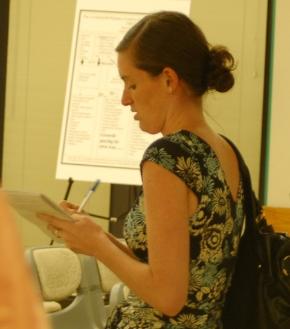 | Cara O'Brien, reporter for the Loveland Reporter-Herald, is seen here taking notes during the first of two public forums hosted by McWhinney Enterprises to gain support for their taxpayer funded trolley for Grand Station. Chad McWhinney stated in letter to the Reporter-Herald, "This statement was outright false!" In a desperate attempt to gain support for taxpayer's funding his trolley ride at the newly announced Grand Station. Click here to read the letter Also, McWhinney calls idea to link trolley to downtown Loveland a "great idea" click here to hear his comments |