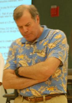 | Centerra President Doug Hill looks to the ground in frustration during a public forum his employer (Chad McWhinney) hosted that turned into a nightmare of negative questions from the public |
