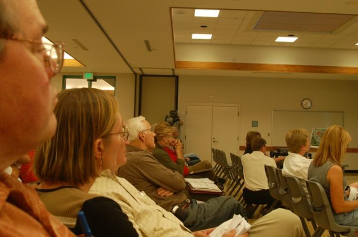 | Loveland residents watch a presentation by Chad McWhinney meant to turn the tide of public opinion to favor taxpayers funding a trolley attraction at Grand Station - in the end the public never seemed to support using tax dollars for the proposed trolley at Grand Station |