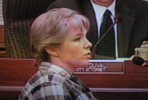 Teri Donovan Kerns of Donovan Construction addresses the City Council March 4, 2008. She complained that the city practice of accepting estimates as full tax payment had been the city's practice for 30 years. Her comments indicated a stand of defiance and readiness to deny paying the city any Use Taxes the audit says are owed.