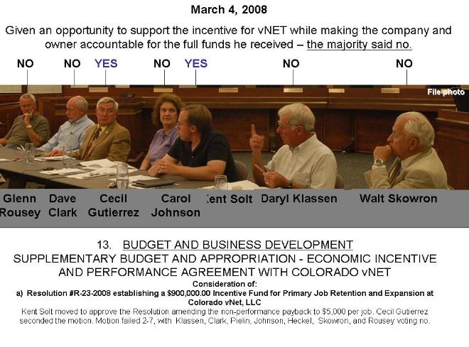 | asking for almost $1 million; he saw a council not in complete agreement. Beierwaltes sought $900,000 in taxpayer money from the city to assist him in relocating the company he started in 2002, vNET, move from its headquarters in downtown Loveland to the old WaterPik building in south Loveland nearer to his home. In exchange for the taxpayer money (to be used for the move and lease-holder improvements) Beierwaltes agreed to employ at It was not a loan but instead called a “business incentive” meant to bring new high-tech jobs to Loveland. VNet appeared like a good candidate for some on council who wanted to take the risk and give Beierwaltes the money in exchange for his promise to bring new jobs to Loveland. As long as Beierwaltes’ vNet could employ at least 250 people in Loveland the money would be his to keep. The council approved Beierwaltes’ request but only after Councilman Kent Solt and Councilman Cecil Gutierrez attempted to create a “clawback” provision that would require vNet to payback the entire subsidy should the company fail to bring any jobs to Loveland. The motion offered by Solt to this effect failed on a 2-7 vote with only Gutierrez and Solt voting yes. Instead, Larry Heckel prevailed along with former Mayor Pro Tem Dave Clark and others in limiting vNet and Beierwaltes’ total exposure in the agreement to only $500,000 under the “Non-Performance Payback” section of the agreement. Key in the city’s agreement with vNet is section 14 called “The Beierwaltes’ Guarantee” that makes a personal guarantee by both Bill Beierwaltes and his wife to make the city whole should their company fail to comply with the terms of the agreement. vNet Goes Out Of Business Seven months after receiving the subsidy to bring new jobs to Loveland, vNet received the NCEDC (Northern Colorado Economic Development Corp.) Economic Development Project of the Year Award. One month later vNet was reported to have laid-off 30 or their 90 employees and by September of 2009 the company closed its doors. Last October the company’s assets were acquired by Russound Acquisition Corp. which promptly changed its name to vNet Corp. and assumed control of the company’s assets including occupying the 42,000 square foot Loveland headquarters of the former L & B, LLC which operated under the name of Colorado vNet. Some of the original vNet employees now work at the new company called vNet Corp. LovelandPolitics learned that as part of the acquisition agreement, Bill Beierwaltes assumed responsibility for $500,000 of the $900,000 paid to his former company by the City of Loveland should the new entity, vNet Corp., become liable for not meeting the terms of the agreement with the city. For their part, the new vNet Corp. and its parent company Russound believe Loveland isn’t owed any money until December of 2012. Currently the new entity has 45 employees and believes the City of Loveland should give them 3 more years before making any determination regarding whether or not vNet (new or old) has lived-up to the terms of the agreement. The legally binding agreement Beierwaltes signed with the City of Loveland doesn’t appear to contemplate a sale of the company but does provide remedies for default if the company is bankrupted or goes out of business. While the business was not sold (only the assets and liabilities) Beierwaltes has kept the original vNet company (B&L, LLC) active but it doesn't appear to have any assets. City of Loveland Likely Planning to Litigate In a tense meeting between the City of Loveland and Bill Beierwaltes along with vNet Corp. CFO Tom Gambon there was no meeting of the minds. Participants on both sides described the meeting as unproductive. At the end of the meeting, City Attorney John Duval reportedly told vNET the city is not beyond litigating to recover the $900,000 according to a source from vNET. Beiewaltes is said to have responded that he spent $1.5 million moving to and improving the old WaterPik building consistent with the agreement. One issue the city has raised is allegedly false information vNET provided Betsy Hale, the business development director who helped to broker the deal regarding the number of employees the company has in Loveland. One city official, speaking off-the- record, told LovelandPolitics that Beierwalts already was in breach of his agreement when he failed to provide the city accurate information during the semi-annual meetings with city staff called for in the agreement. Sources inside city hall say the City Manager Don Williams isn't likely to implement council direction to call Beierwaltes into default of the agreement until after the upcoming election in Ward 1. Williams may feel the business incentive failure being made public now will hurt the "old guard" candidate. The Loveland City Council has spent considerable time behind closed doors discussing the vNet business incentive in Executive Session closed to the public. The State of Colorado limits what topics may be discussed behind closed doors but planning litigation is one of the very few exceptions. Since vNet doesn’t involve a personnel matter or property acquisition negotiations (the other two reasons for executive sessions) one can easily assume the city is now considering its options to litigate the matter in court should Beierwaltes continue to refuse to payback the money. The vNET View According to one source working in vNet Corp. currently, Beierwaltes "lost his ass on vNET" and therefore should not be expected to pay the City of Loveland any of the money back. The same source told LovelandPolitics "we would like to have the agreement transferred. We invested money into the community and spent all of the $900,000 right here." The same source stated the company believes that Beierwaltes has tried to live to the intent of the agreement but the recent economic recession sunk his business when the housing market collapsed. |
