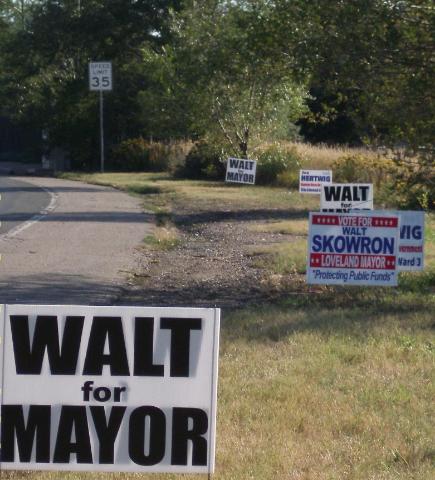 | Below - Commercial property owned by William Beierwaltes on South Taft in Loveland is lined with signs supporting Walt Skowron for Mayor. Click here to view more information regarding the exact location of these signs |